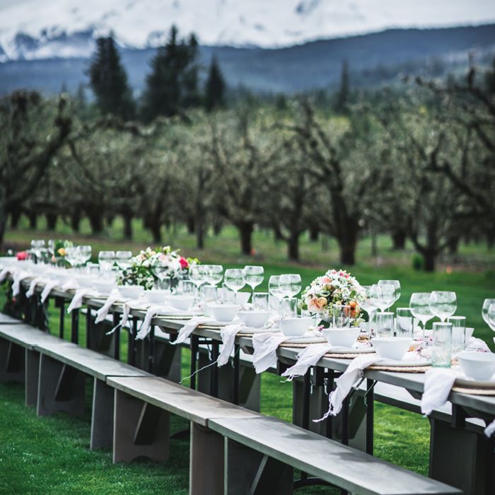 For the ultimate dinner party place setting, start with a charger, then layer a classic white dinner plate as a blank canvas.